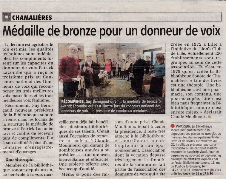 Patrick LACOMBE, donneur de voix a reçu le troisième prix au concours national des donneurs de voix. L'article du journal "La Montagne" du 22 mars 2017 relate la cérémonie de remaise de la récompense.